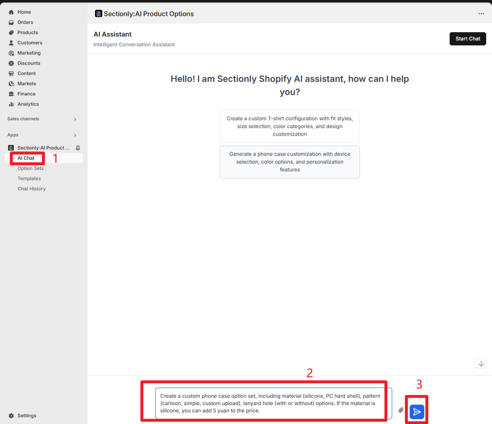 In the chat input field, describe your product option set requirements in natural language. You can use plain text, images, attachments, links, and other formats to assist with explanations.