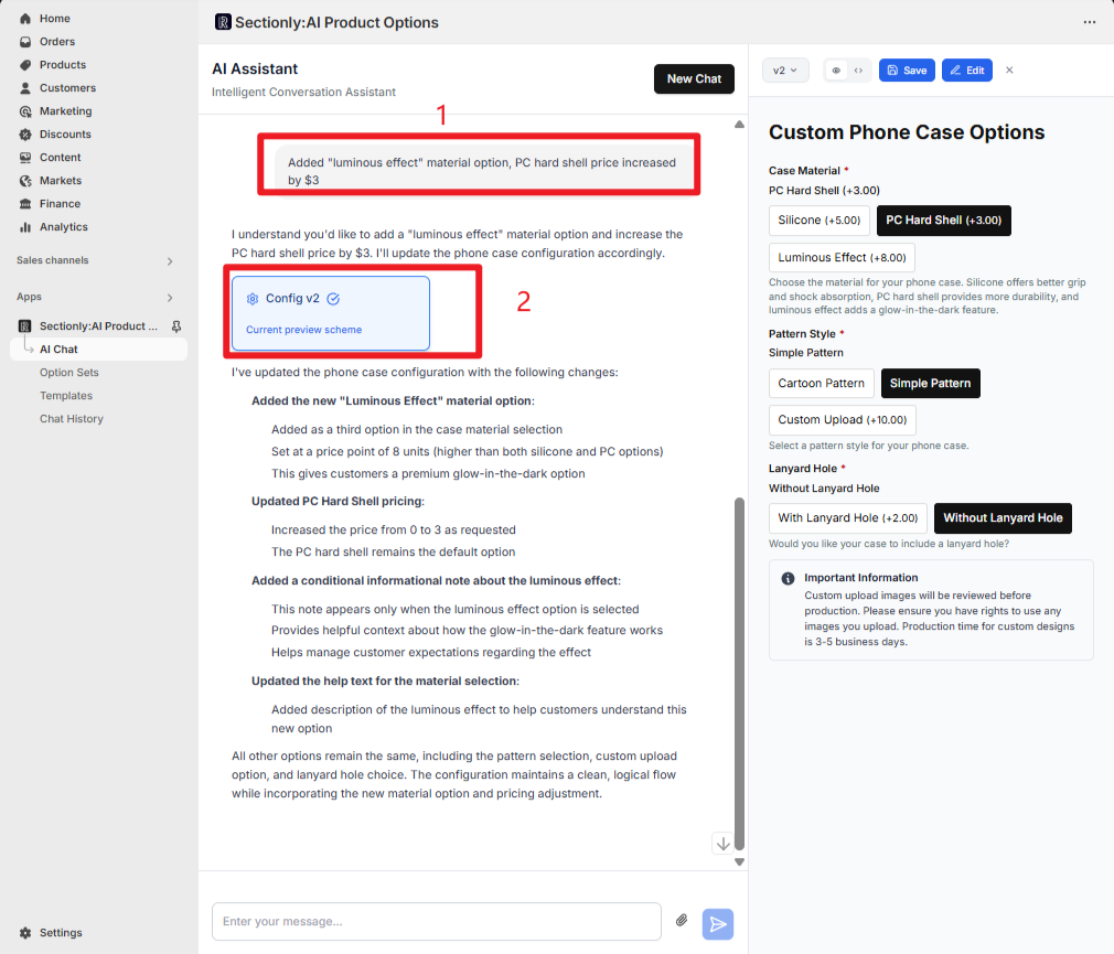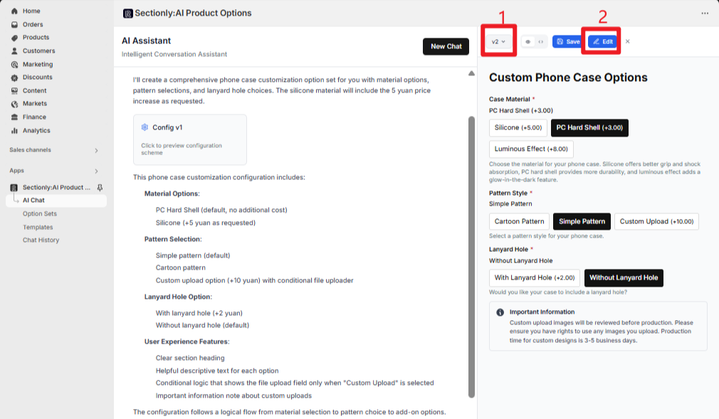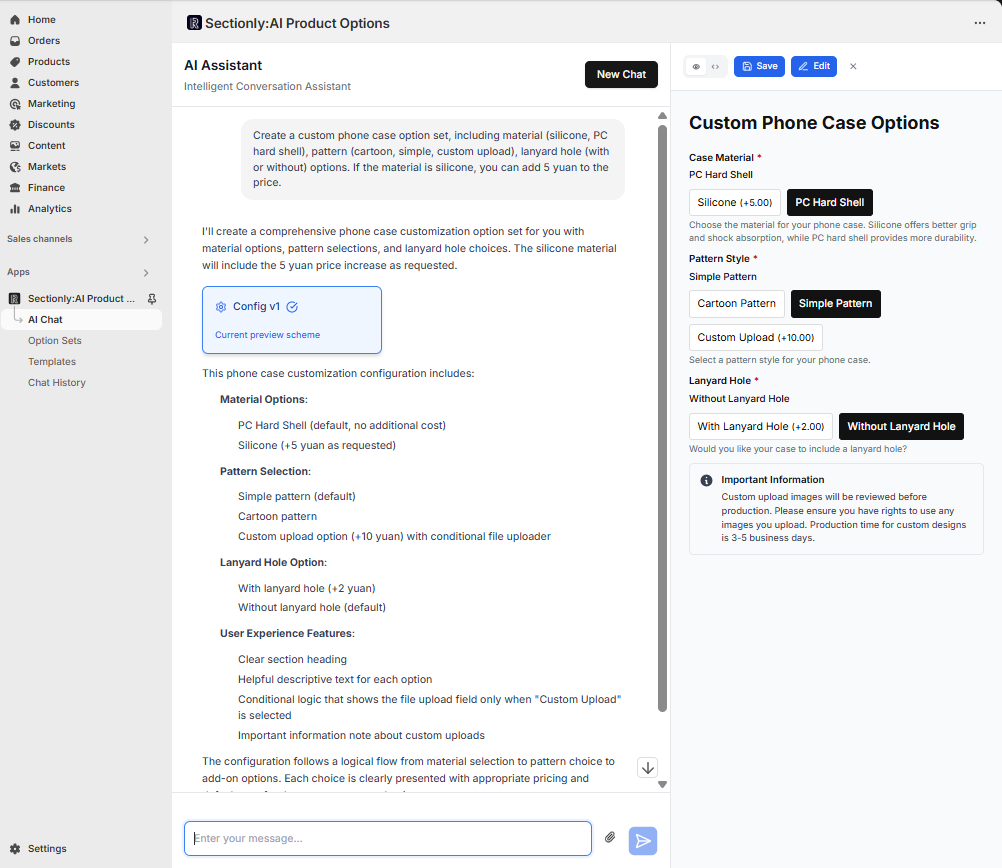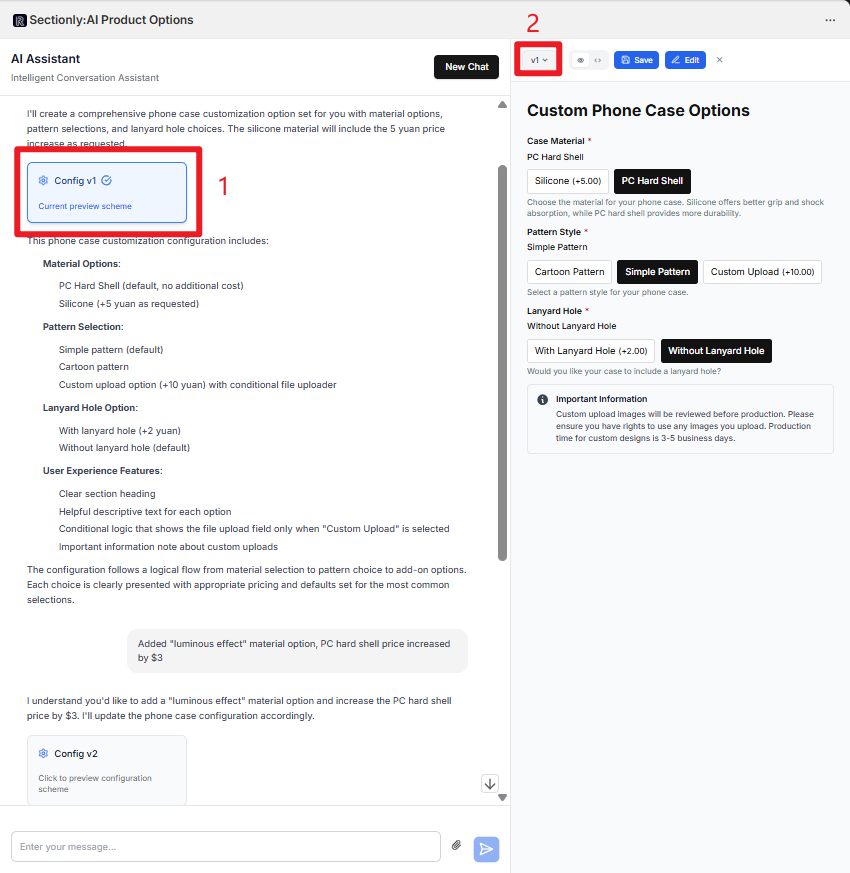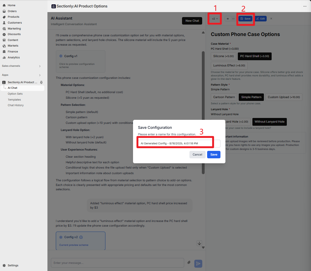 This guide provides a comprehensive walkthrough of using AI functionality to quickly create product option sets, including requirement descriptions, conversational interactions, version management, and configuration saving.