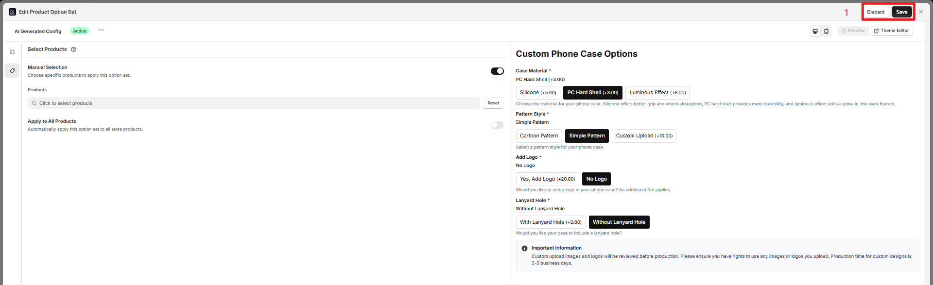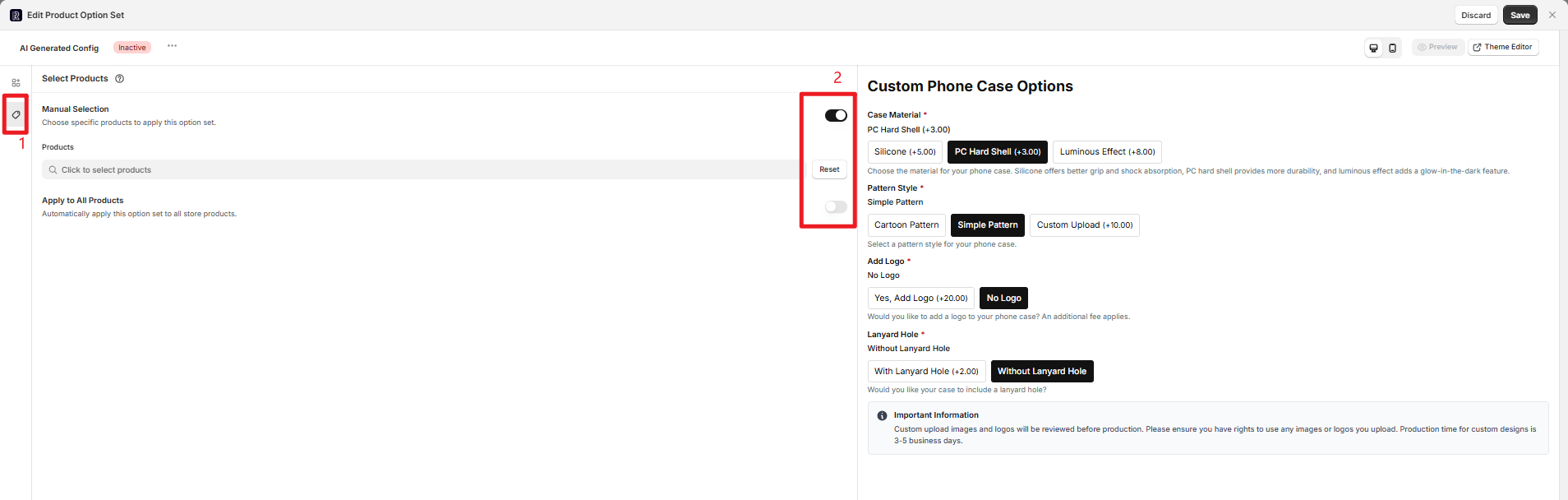 Enable the "Apply to All Products" toggle to automatically apply the option set to all products (suitable for universal customizations like "gift box packaging for all products")